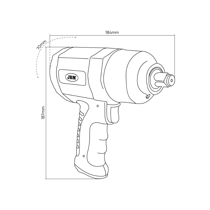 EAN: 8435034536089 Veličina kvadratnog pogona 1/2" Ulaz zraka 1/2" Maksimalni moment pritezanja 880Nm Maksimalni moment kidanja (otpuštanja) 1200Nm Nazivna brzina 7500RPM Stvarna potrošnja zraka 6,5CFM (183,5L/min) Radni pritisak 6,2BAR Intenzitet zvuka 107dB Sistem čekića Dvostruke/Dvostruke brzine 4 Udara u minuti 950 Težina 2,35Kg Dimenzije (DxŠxV) 187x71x184mm