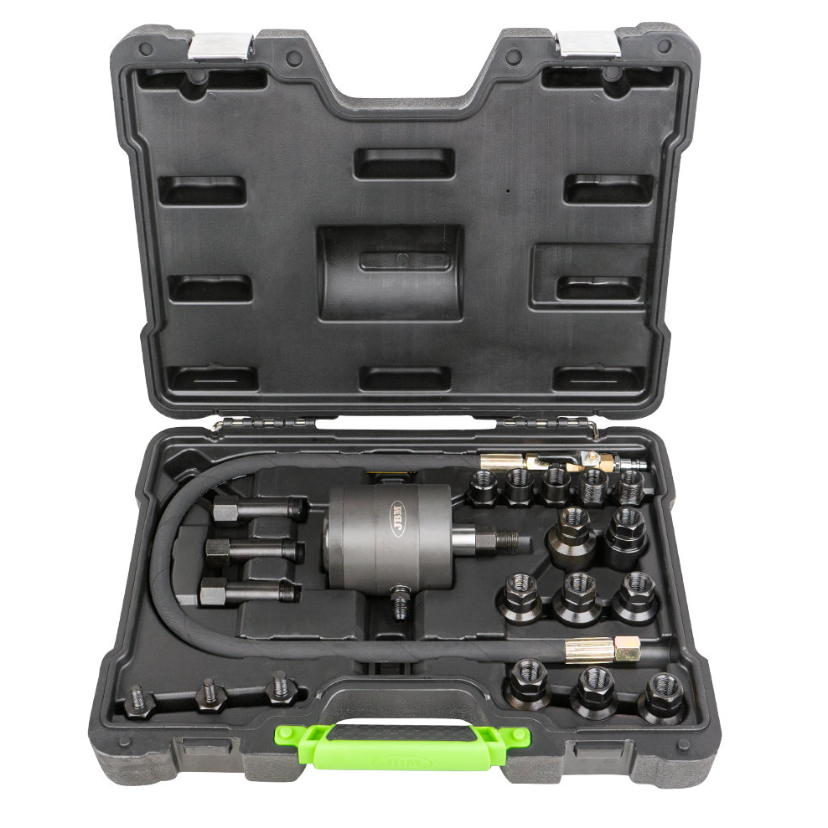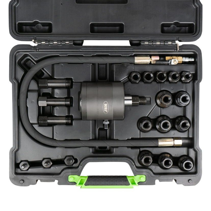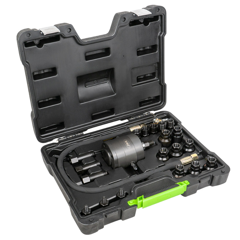 Profesionalni i svestrani pneumatski ekstraktor injektora. Ovaj ekstraktor koristi pneumatsku silu kako bi olakšao brzo i sigurno uklanjanje dizel injektora (dizne). Sadrži nekoliko adaptera kompatibilnih s najčešćim modelima na tržištu, osiguravajući široku kompatibilnost. Kompatibilan je s injektorima proizvođača: Bosch, Delphi, Denso, Siemens i navojnim spojevima. Specifikacije: · Radni pritisak: 5-8 bara · Protok zraka: 50 L/min (1,76 CFM) · Dimenzije klipa: širina 82 mm / dužina 140 mm · Obrtni moment izvlačenja: 500-700 Nm · Udara u sekundi: 20-30 · Brzina čekića: 1200–1800 BPM · Obrtni moment zatezanja alata: 20–30 Nm UKLJUČUJE: · Profesionalni pneumatski čekić za maksimalnu efikasnost · Uključuje produžetak za jednostavno uklanjanje injektora · Adapteri M20*1.0, M18*0.75, M17*1.0 · Adapteri M8*1.25, M8*1.0, M8*1.5 · Adapteri M14*1.5, M16*1.5, M18*1.5 M20*1.5, M22*1.5 · Adapteri M25*0.5, M25*1.0 · Adapteri M26*0.75, M29*1.0, M31*0.75 · Adapteri M27*0.75, M27*1.0, M14x1.5 12MM, M14x1.5 13.5MM, M14x1.5 16MM